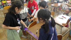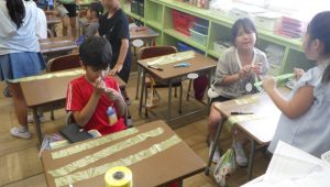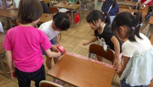 子どもたちはグループで協力しながら、テープを机の端から端までぴったりと伸ばして、長さを写し取っていきました。