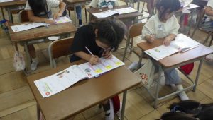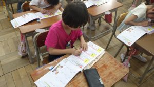 教科書やプリントに丁寧に書きながら、形や意味を一生懸命覚えています。