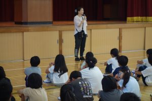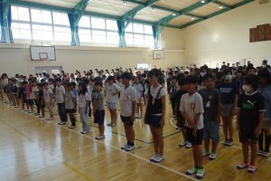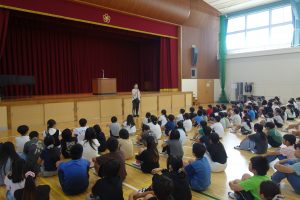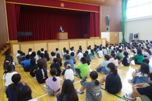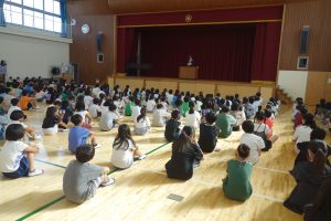 この日は10月の朝礼が、体育館で行われました。まず、校長先生の話でした。何かに取り組むとき、ゴール以上にその途中の道のり(過程)が大切だという話でした。その後、校務先生から前日の日曜日に地域の方々が蛭間小学校の草刈りをしてくださったこと、そしてこの日の朝、地域の方々が刈った草を集めに来てくださっていることを教えていただきました。いつも、地域の方々がみなさんのために動いてくださっています。感謝を忘れてはいけませんね。