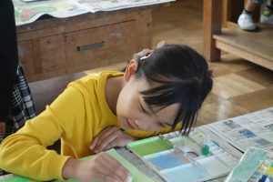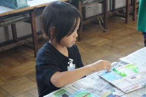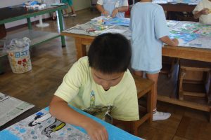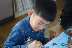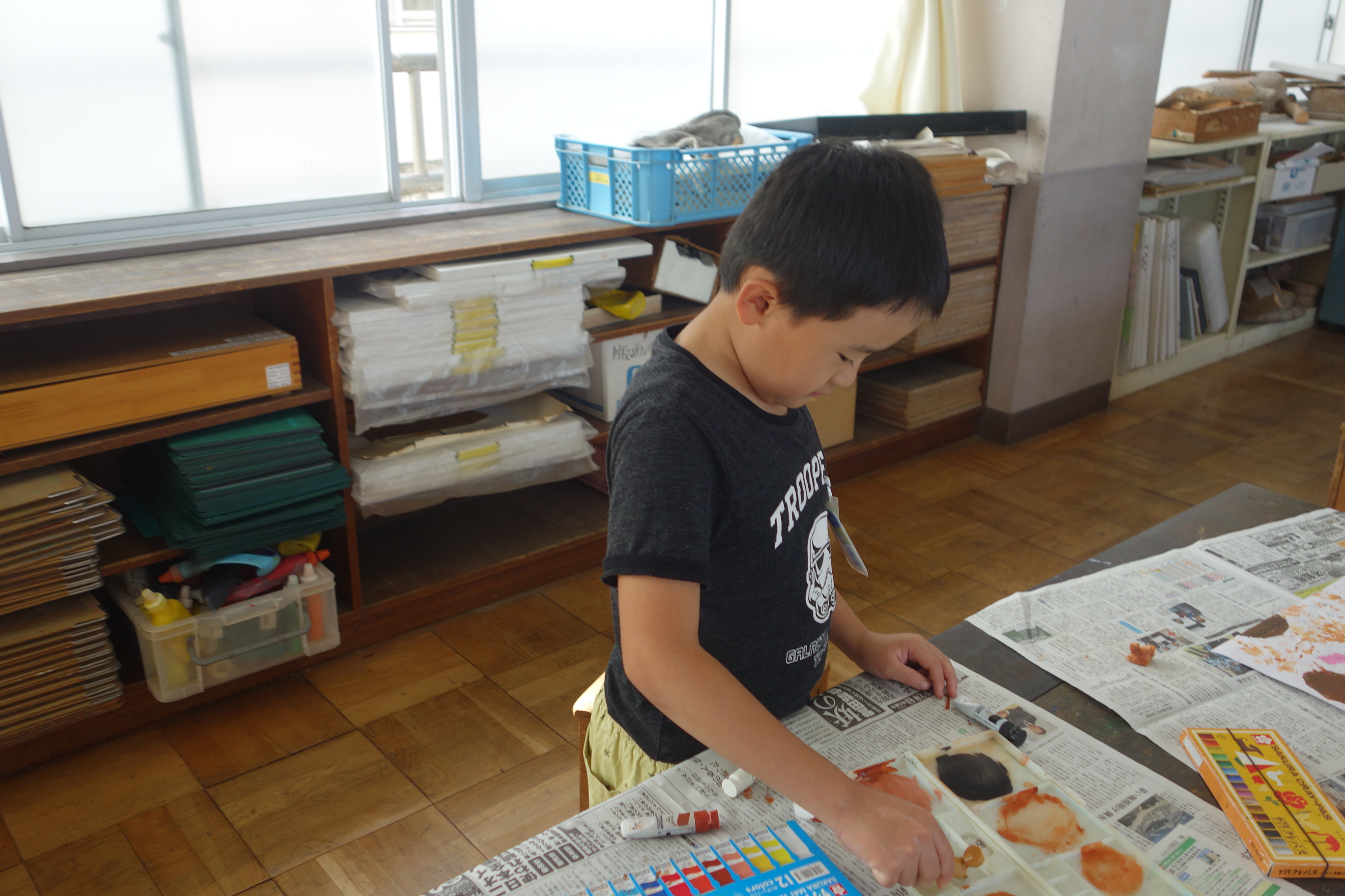 2年生の図画工作は、『ふしぎなたまご』の制作を進めています。この日は、絵に絵の具で色をつけました。筆だけでなくスポンジなども使って、色のつけかたを工夫しました。この時間は、着色を工夫しているときの子どもたちの表情を中心に写真を撮りましたので、制作中の作品自体はあまり映っていません。どんな作品に仕上がるのかは、完成までお待ちくださいね。