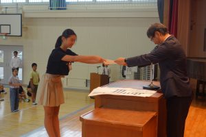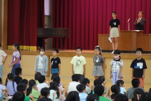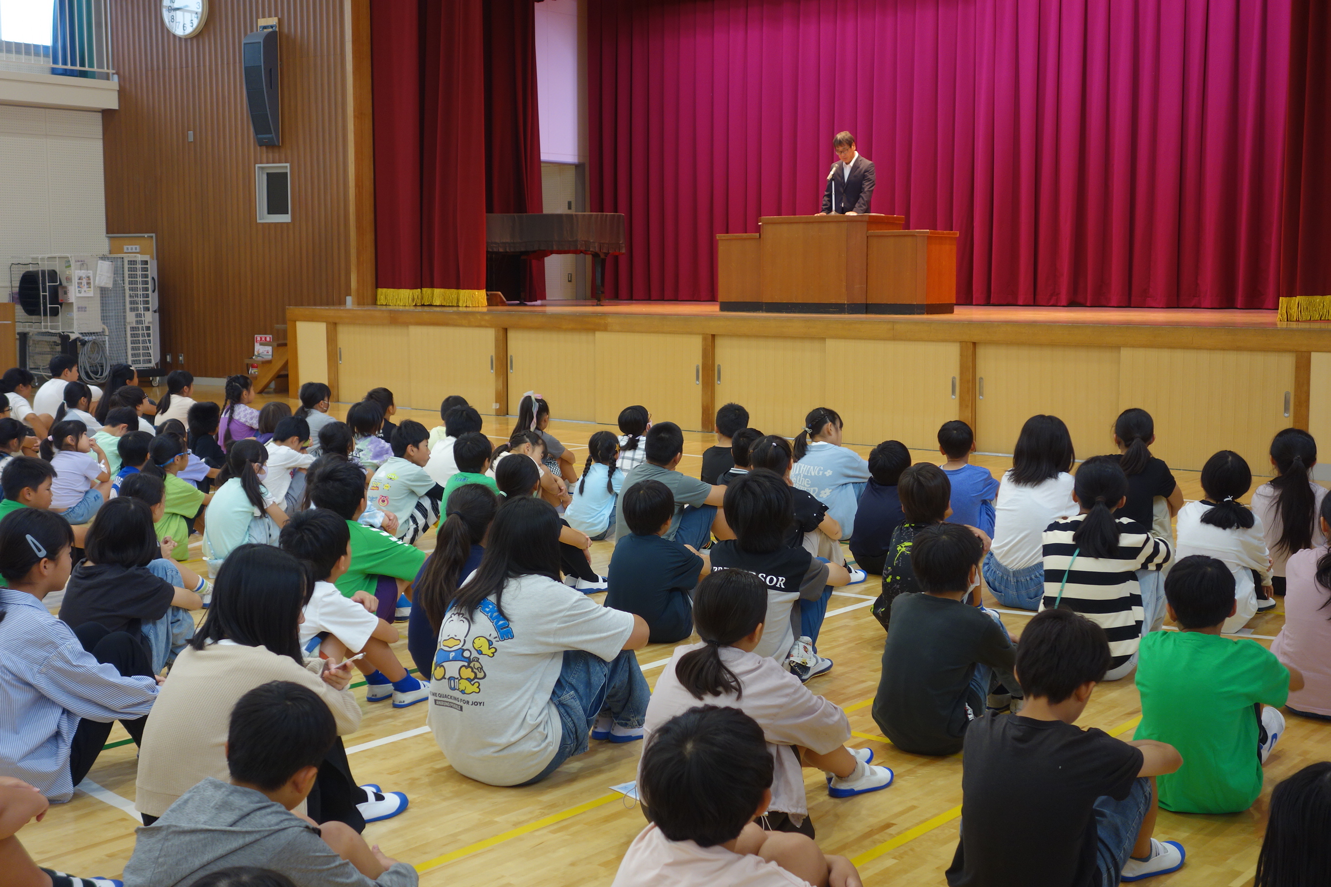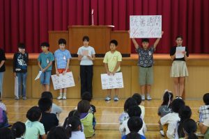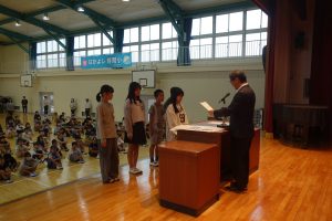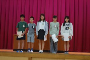 後期が始まりました。1年の折り返しの日です。朝、体育館で後期の始業式を行いました。校長先生の話の後に、児童会役員の認証と委員会委員長の認証、学級委員の認証がありました。最後に図書委員会の読書週間の話とクイズがありました。後期も、充実した学校生活を積み重ねていきましょう。