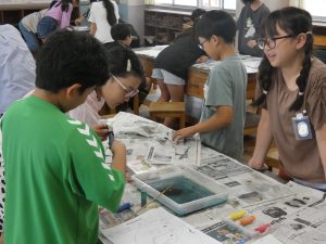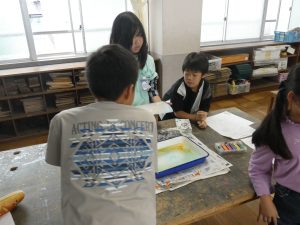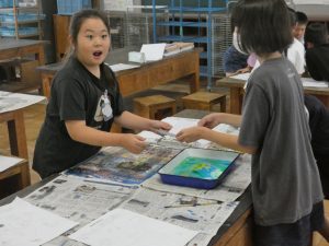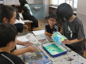4年生 マーブリング 4年生 2025.10.16 図工でマーブリングをやってみました。 さまざまな色のインクが漂う水面に画用紙を浮かせます。 グループのみんなで「1・2・3…」と決められた時間を数えて画用紙をそっとあげると、 想像以上の模様にびっくり!