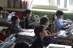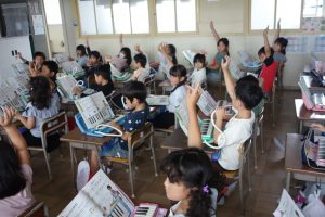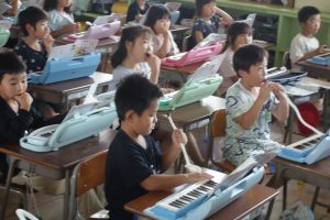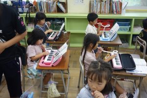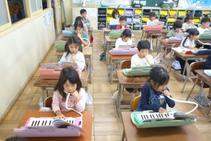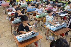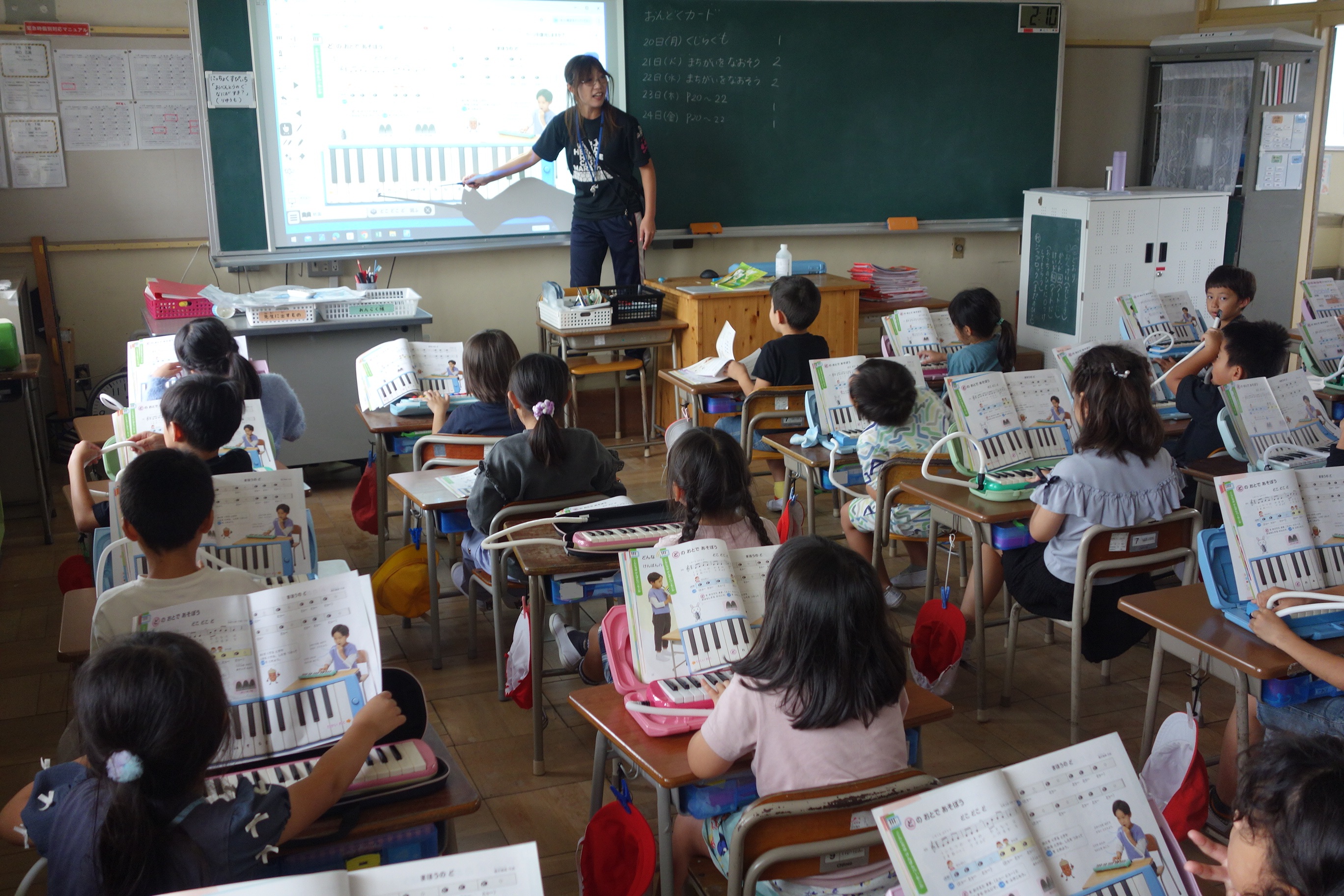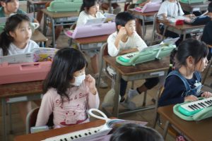 1年生の音楽は、鍵盤ハーモニカの練習をしました。まずは『ド』の音が出る鍵盤がどこにあるのかを探しました。ドの鍵盤を見つけたら、つぎはどの指で押さえるのかを学びました。使わない指も広げて押さえることが大切でしたね。みなさん、上手にドの音が出せました。