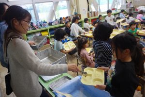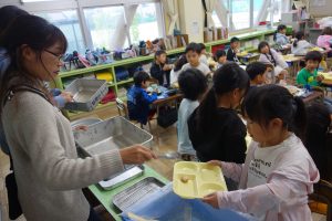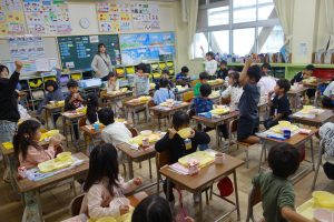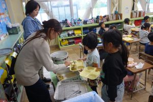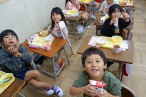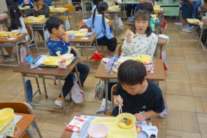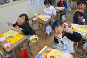 おいしい給食 1年生 2025.10.22 給食の時間に1年生の教室を訪ねると、唐揚げを満面の笑みで食べているところでした。早く食べ終えた子の中には、おかわりをしている子もいました。ごはんや野菜などもまんべんなく食べているようでした。素晴らしい食習慣が身についていますね。