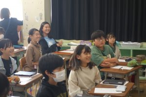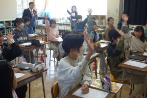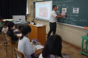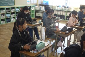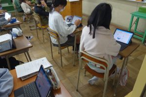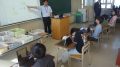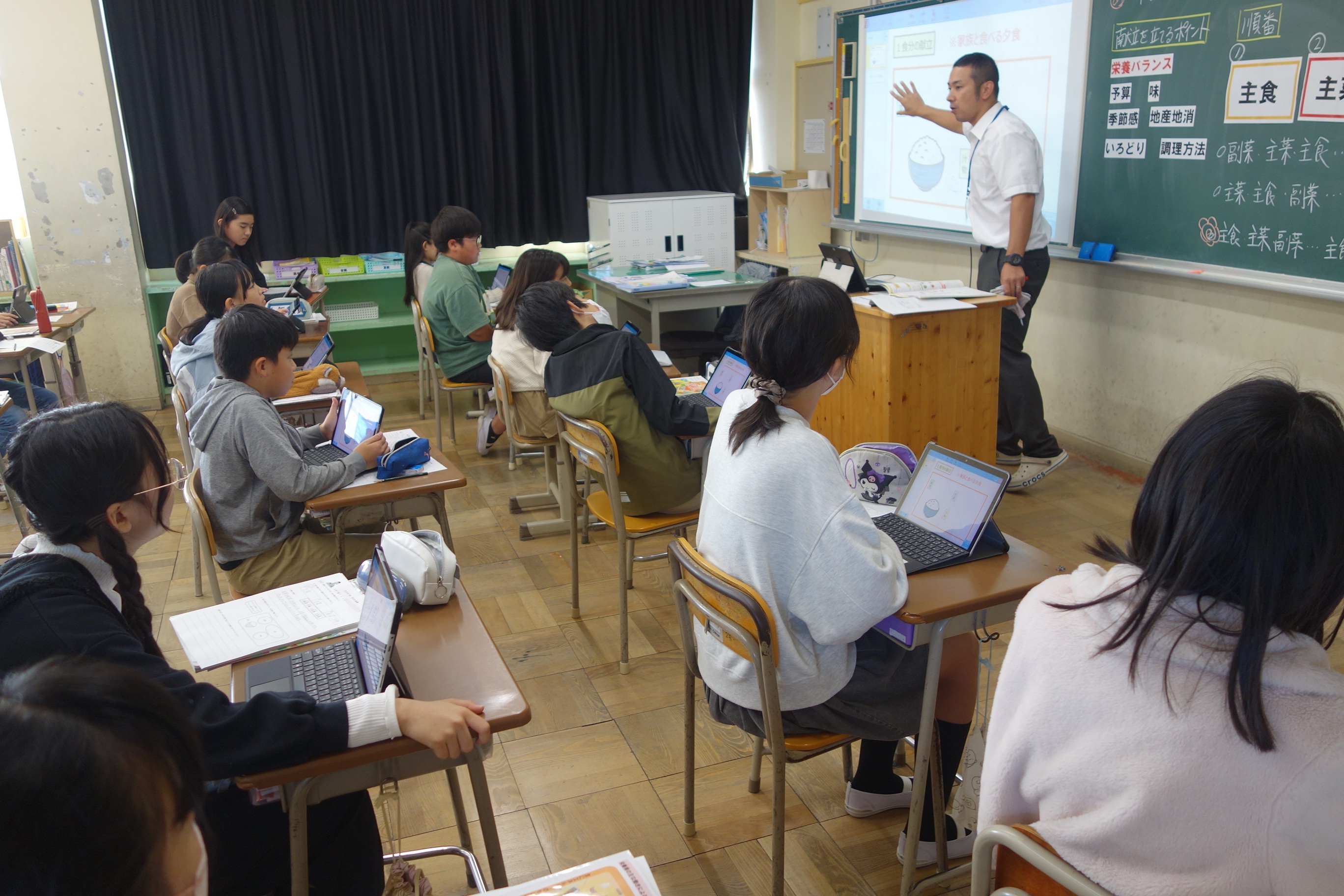 6年生の家庭科では、栄養バランスのとれた食事のメニューについて考えています。この日は、献立を立てる際に、主食、主菜、副菜のどれからメニューを決めるかについて話し合いました。その後で、家族と食べる夕食1食分の献立をタブレット端末の中で作りました。栄養バランスを考えて作ることができました。