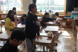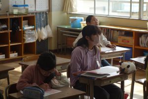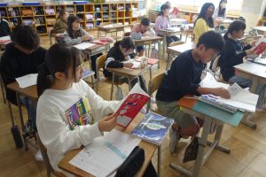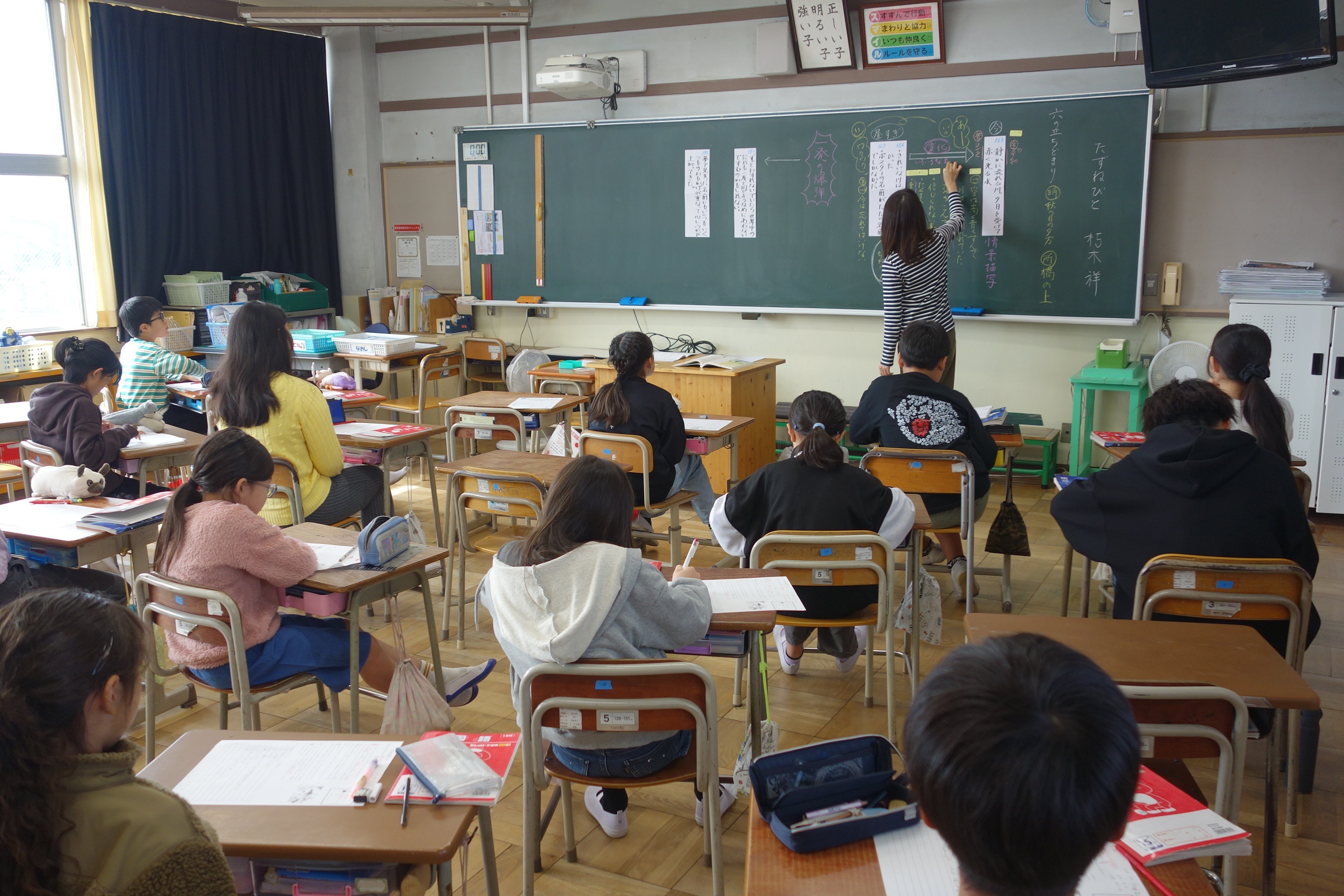 5年生の国語は、物語文『たずねびと』の読み取りを進めています。文中に示された行動や会話、心情や情景を表す表現に着目して、登場人物の心情の変化を追っています。活発な意見交換のおかげで、学級全体としての深い読み取りにつながっていたようです。