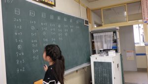 算数では、繰り上がりのあるたし算の計算カードに取り組みました。