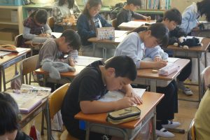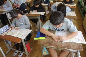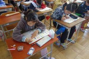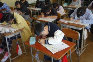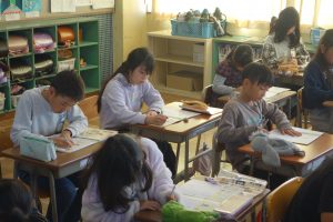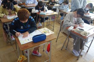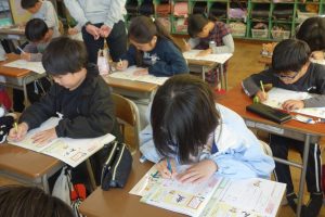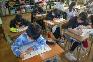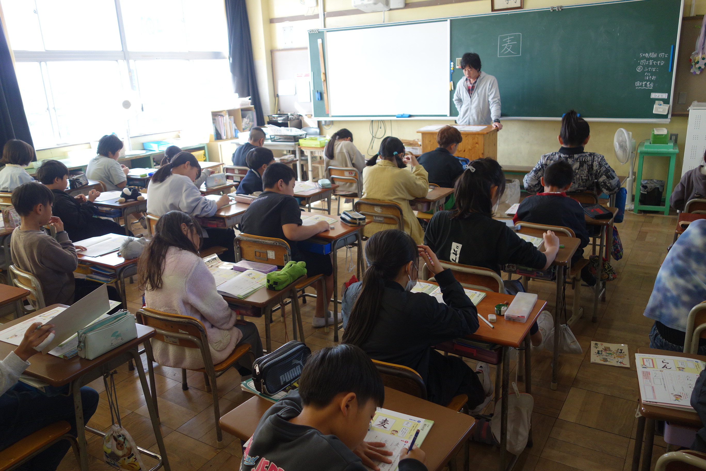 書写 4年生 2025.10.29 4年生の書写は硬筆の学習でした。「麦」という字を中心に、はらいの練習をしました。先生の説明を聞いた後、かきかたノートの「麦」「夏」「友」「返」等の字を書きました。みなさん、はらう部分を意識して書いていました。