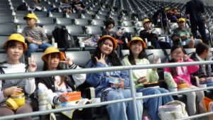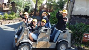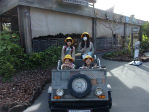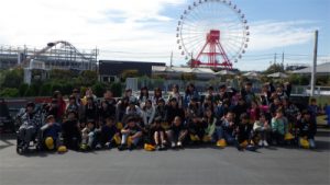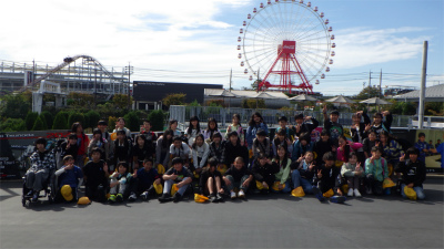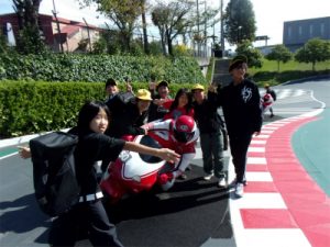 午前中は鈴鹿サーキットで班行動。事前に班ごとに話し合って決めていたアトラクションに乗り、楽しみました。その後は、学年全員でサーキットの観客席からバイクの練習を観ながらの昼食タイム。