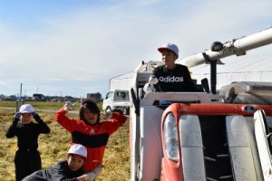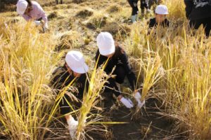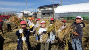 11月6日(木)の稲刈りの様子です。アグリセンター宇治の方々のご厚意で稲刈りを体験させていただきました。鎌を使って稲を刈るのは少し難しい様子でしたが、だんだんコツをつかんで上手にできるようになりました。また、最後には、コンバインに一人一人乗せてもらいました。