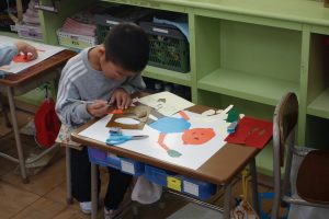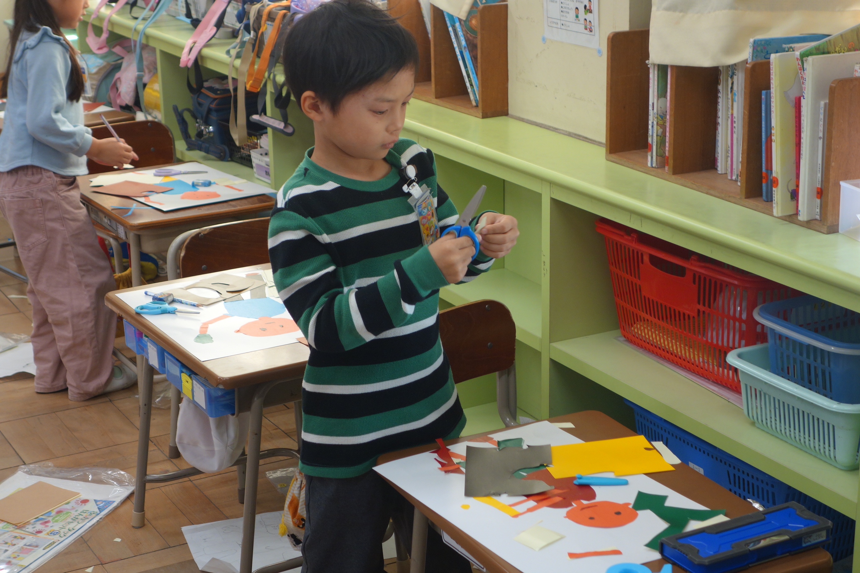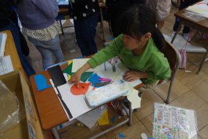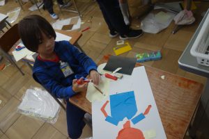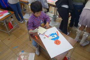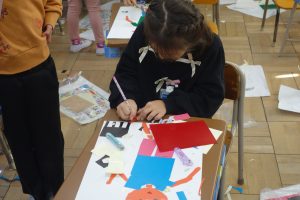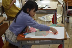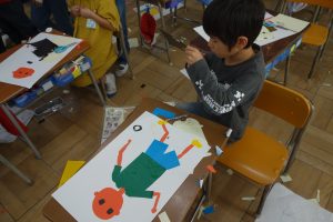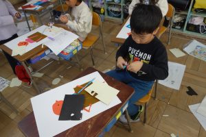 紙版画 1年生 2025.11.07 1年生の図画工作は、紙版画の制作に取りかかっています。自分を主人公にした作品です。作品のそれぞれの部分が紙なので、ハサミを使い1つ1つ切って形にしなくてはなりません。結構大変な作業ですが、みなさん黙々と切っていましたね。