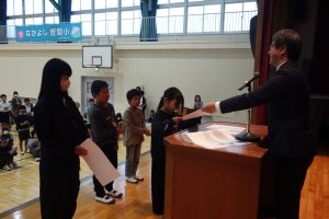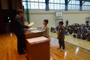 学校行事この週は朝礼から始まりました。全校で体育館に集まりました。最初に天王祭りポスターと書写コンクールの表彰がありました。その後、校長先生の話があり、最後に児童会からの赤い羽根募金の連絡がありました。児童会は寸劇で連絡をしてくれるので、楽しく聞くことができましたね。