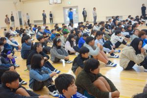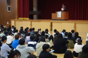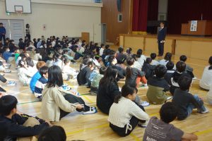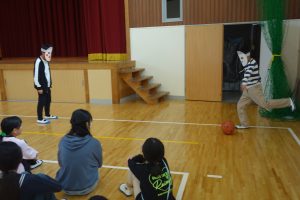 この週は朝礼から始まりました。全校で体育館に集まりました。最初に天王祭りポスターと書写コンクールの表彰がありました。その後、校長先生の話があり、最後に児童会からの赤い羽根募金の連絡がありました。児童会は寸劇で連絡をしてくれるので、楽しく聞くことができましたね。