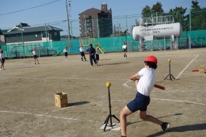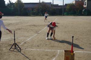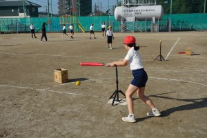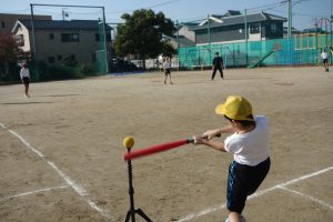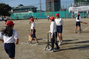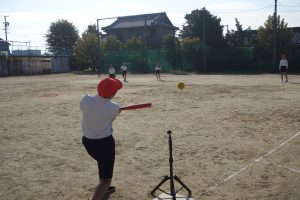 6年生6年生の体育はTボールに取り組んでいます。この日は風もなく温かかったので、運動するのには絶好のコンディションでした。皆さんはゲームに慣れてきたようで、バッティングの技術や守備の技術が向上してきています。打たれたボールを早いタイミングで守備が止めて、点数を抑える場面がありました。