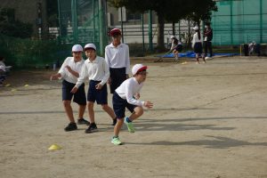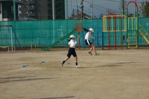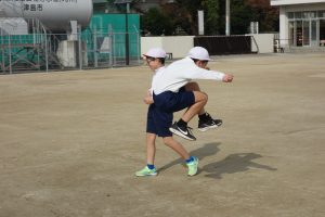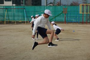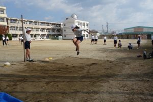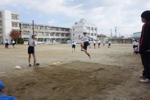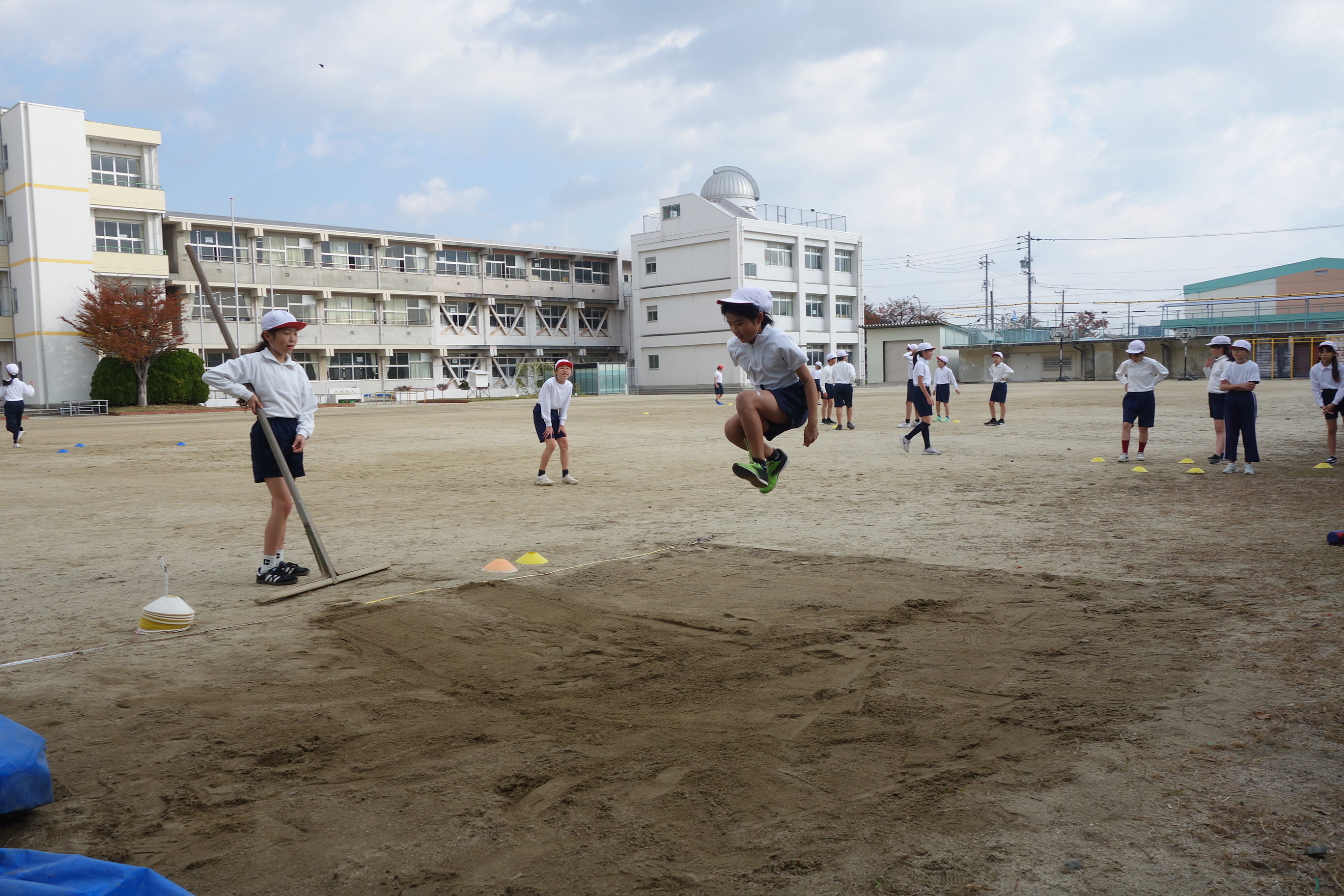 5年生5年生の体育では、幅跳びを練習しています。より遠くへ跳べるように、助走の速さや踏切にむけた歩幅、跳んだときの姿勢などを工夫しながら練習しています。砂場で飛距離を測定している班だけでなく、砂場を使っていない班もグランドに目印を置いて課題練習に取り組んでいました。無駄な待ち時間などがないので、より早い技能の上達が期待できますね。