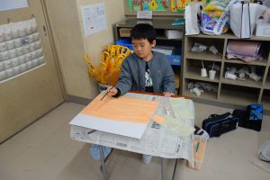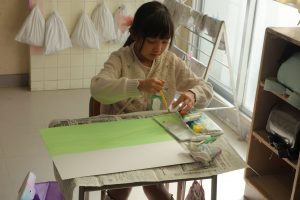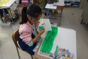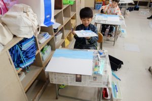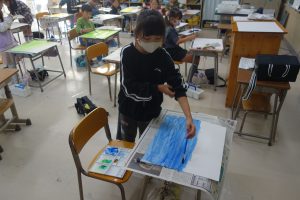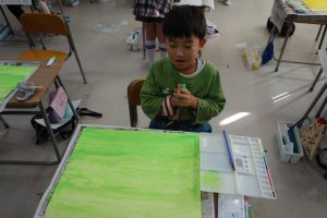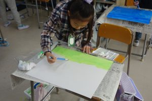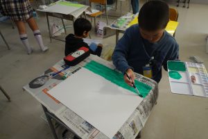 2年生の図画工作は、『友だちハウス』という作品に取りかかっています。この日は、友だちハウスのバックになる部分の紙に絵の具で色を付けました。友だちハウスとバックを組み合わせたときをイメージして色を決め、丁寧に塗りました。作品の完成が楽しみですね。