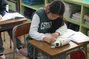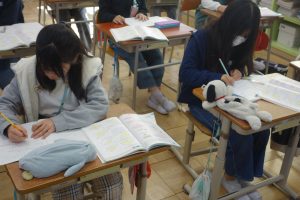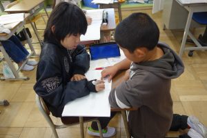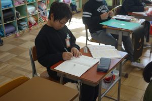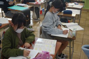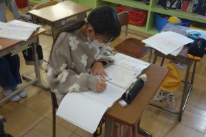 5年生の算数は、面積の学習を進めています。今まで三角形の面積、平行四辺形の面積、台形の面積、ひし形の面積について学習してきました。この日は、学んだことをいかして練習問題を解きました。みなさん、黙々と取り組んでいましたね。また、解き方を教え合う姿もありました。