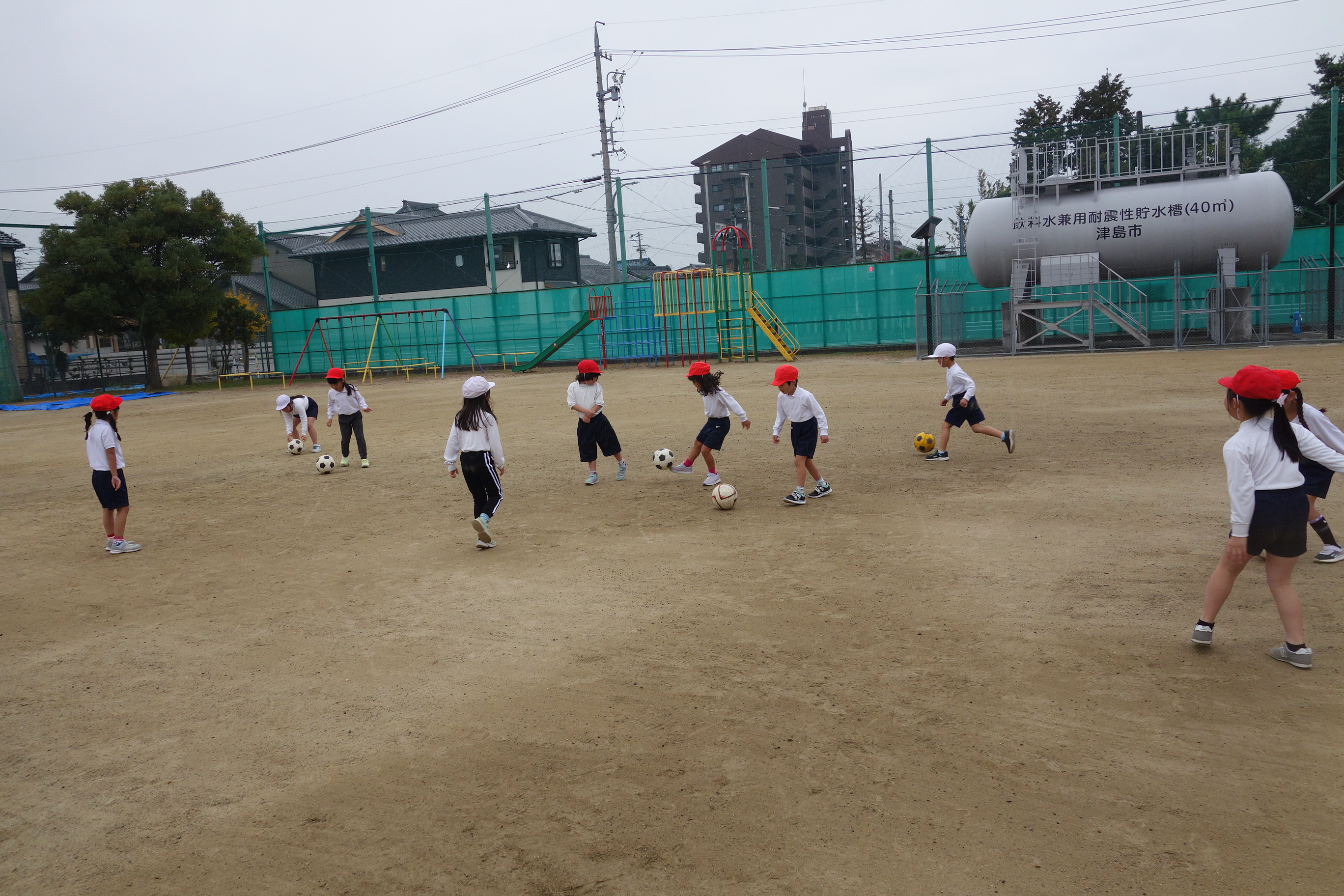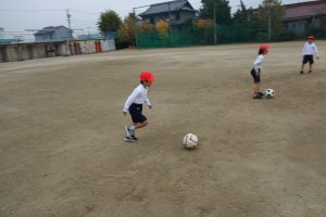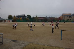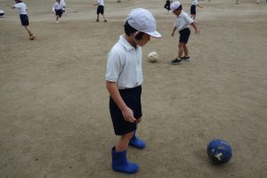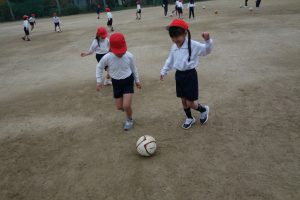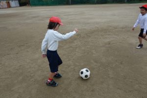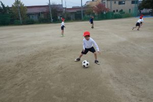 サッカーの練習 1年生 2025.11.25 1年生の体育は、サッカーの練習をしました。まずは、ボールを相手に蹴って渡したり、転がってきたボールを足で止めたりする練習です。みなさん、ペアを組んで楽しそうにボールを追いかけていました。