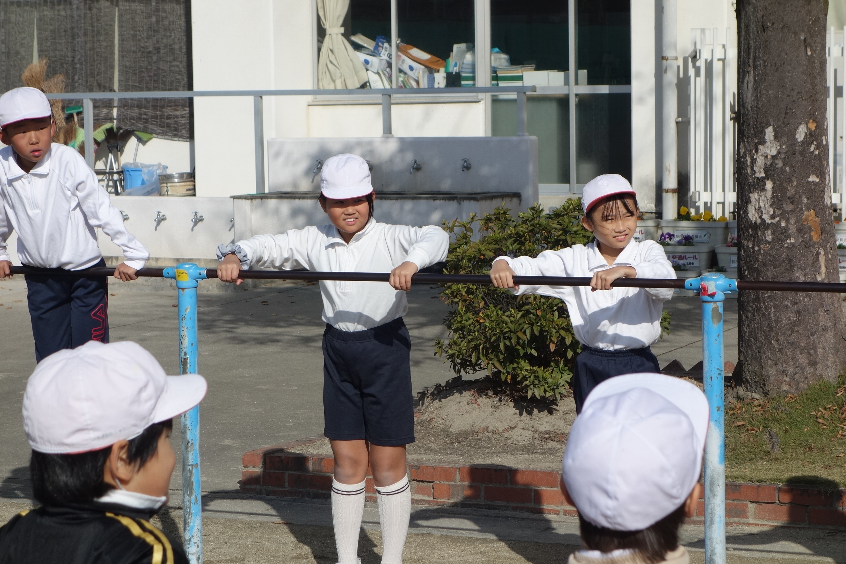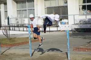 3年生が鉄棒に取り組みました。棒にぶら下がったり棒を越えるように降りたりと、とても多くの技に挑戦しました。安全第一なので、できない技に無理に挑戦したりしませんが、できそうな子は、ぶら下がったときに手を放してみるなど、技の難易度を上げて挑戦しました。逆上がりのときには「やった、一発でできた!」と、喜びのつぶやきが聞こえました。