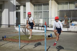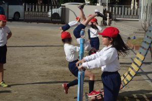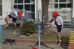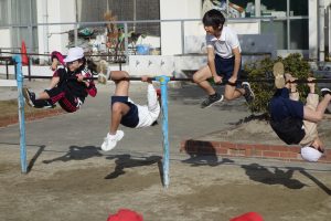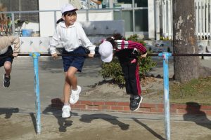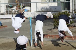 3年生3年生が鉄棒に取り組みました。棒にぶら下がったり棒を越えるように降りたりと、とても多くの技に挑戦しました。安全第一なので、できない技に無理に挑戦したりしませんが、できそうな子は、ぶら下がったときに手を放してみるなど、技の難易度を上げて挑戦しました。逆上がりのときには「やった、一発でできた!」と、喜びのつぶやきが聞こえました。