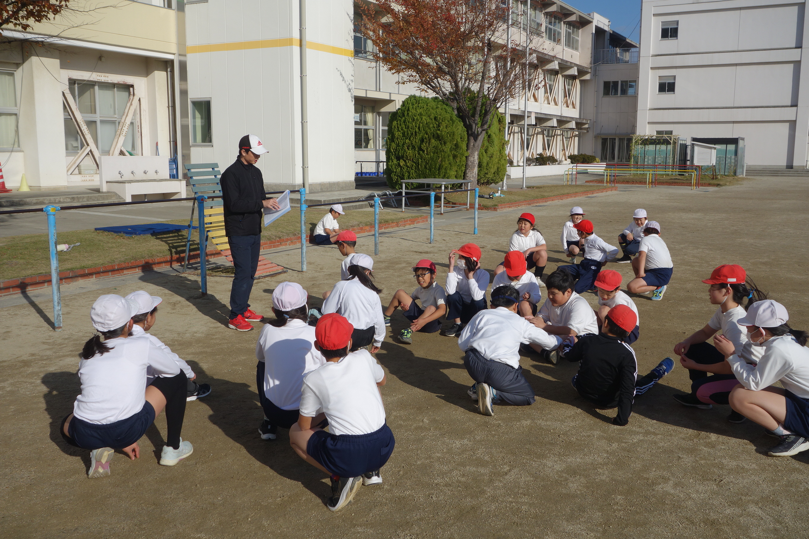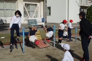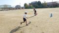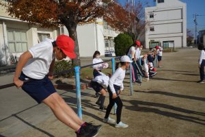午前中の3年生に続いて、午後は4年生が鉄棒に取り組みました。4年生は鉄棒から降りる技に挑戦していました。足でぶら下がって逆立ちのように降りたり、鉄棒を踏むようにして飛んで降りたりと自分にできそうな技に挑戦しました。みんなにアドバイスを受けながら技を完成させた子の中には、ジャンプして喜んでいる子もいました。