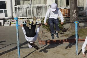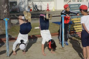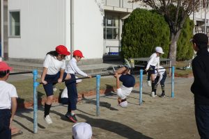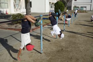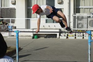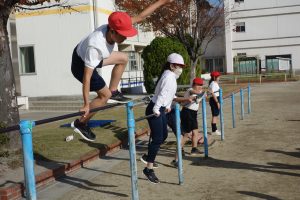 4年生午前中の3年生に続いて、午後は4年生が鉄棒に取り組みました。4年生は鉄棒から降りる技に挑戦していました。足でぶら下がって逆立ちのように降りたり、鉄棒を踏むようにして飛んで降りたりと自分にできそうな技に挑戦しました。みんなにアドバイスを受けながら技を完成させた子の中には、ジャンプして喜んでいる子もいました。