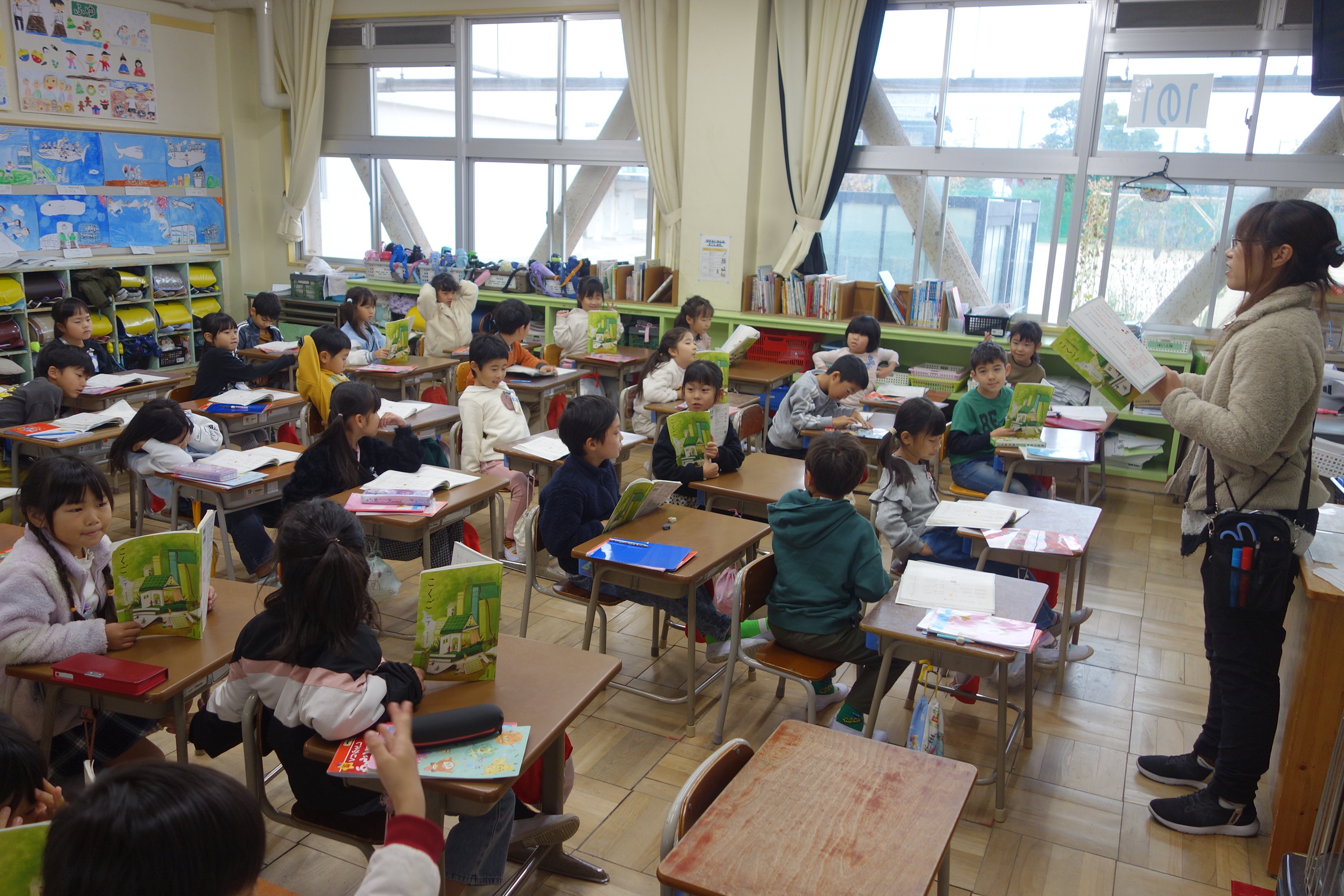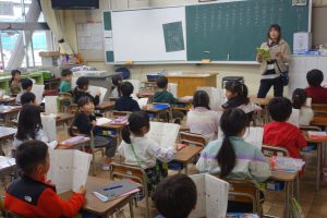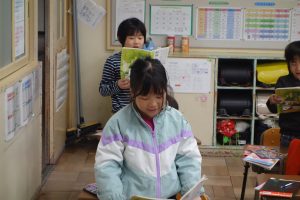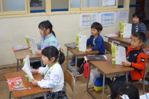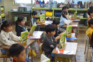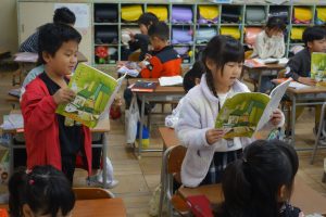 1年生の国語は、日付歌の音読をしています。まず、日付歌に出てくる漢字の読み方を覚えてから、日付歌の音読練習に入りました。まずは、席ごとで音読しました。それから、自分の誕生月を順番に読みました。楽しく日付の読み方を覚えることができました。