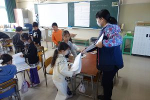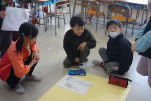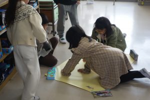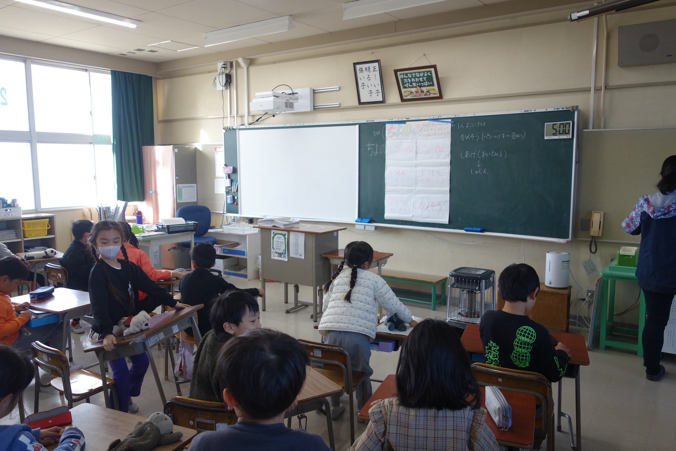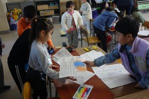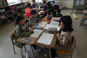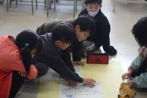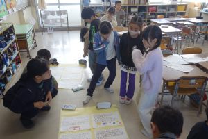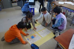 2年生の生活科では、町探検で調べた内容をB紙にまとめました。最初に、B紙にどのようなレイアウトでまとめるかの説明を聞きました。それから班に分かれて、今まで分担してまとめていた用紙を持ち寄って、B紙に並べました。立派なまとめができあがりそうです。