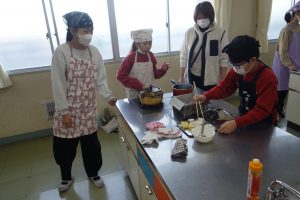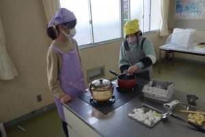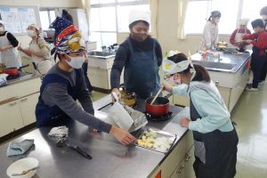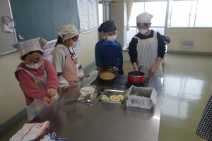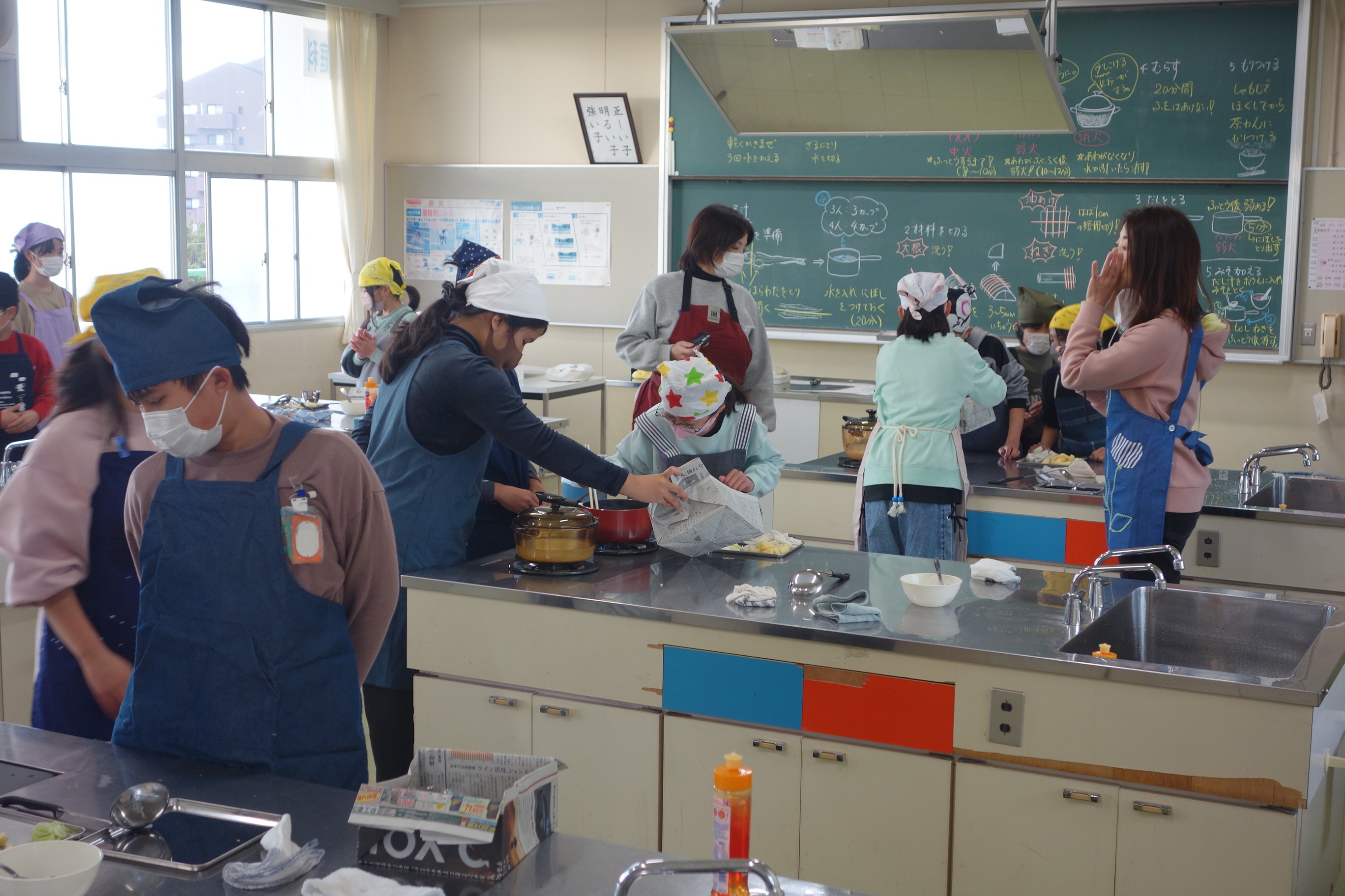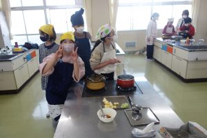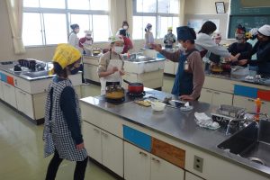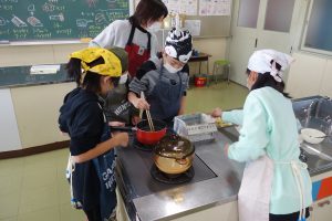 5年生5年生の家庭科は調理実習でした。グループになって、ごはんとみそ汁をつくりました。みそ汁は、にぼしから出汁をとる本格的なものです。調理の手順を聞きながら班の仲間と協力して作業を進めていると、家庭科室にだんだんいい匂いが満ちてきましたね。