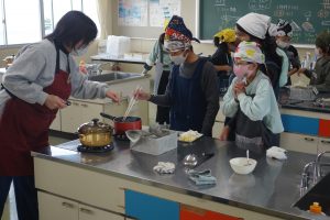 5年生の家庭科は調理実習でした。グループになって、ごはんとみそ汁をつくりました。みそ汁は、にぼしから出汁をとる本格的なものです。調理の手順を聞きながら班の仲間と協力して作業を進めていると、家庭科室にだんだんいい匂いが満ちてきましたね。
