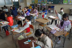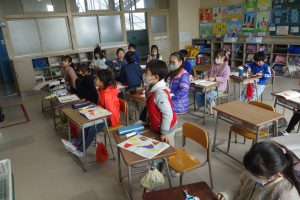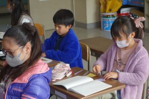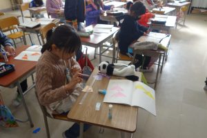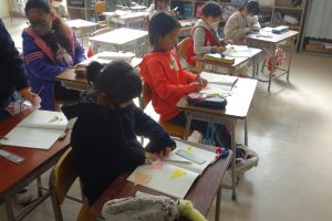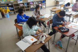 2年生の算数は、図形の学習をしています。この日は三角形や四角形の紙を切って,新たに三角形や四角形を作ってみました。同じ三角形でも、頂点と辺を結んだ直線で切ると三角形が2つでき、辺と辺を結んだ直線で切ると三角形と四角形ができることが分かりました。