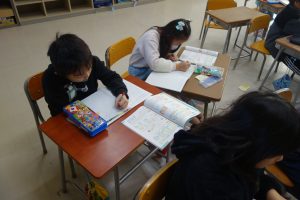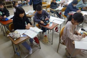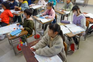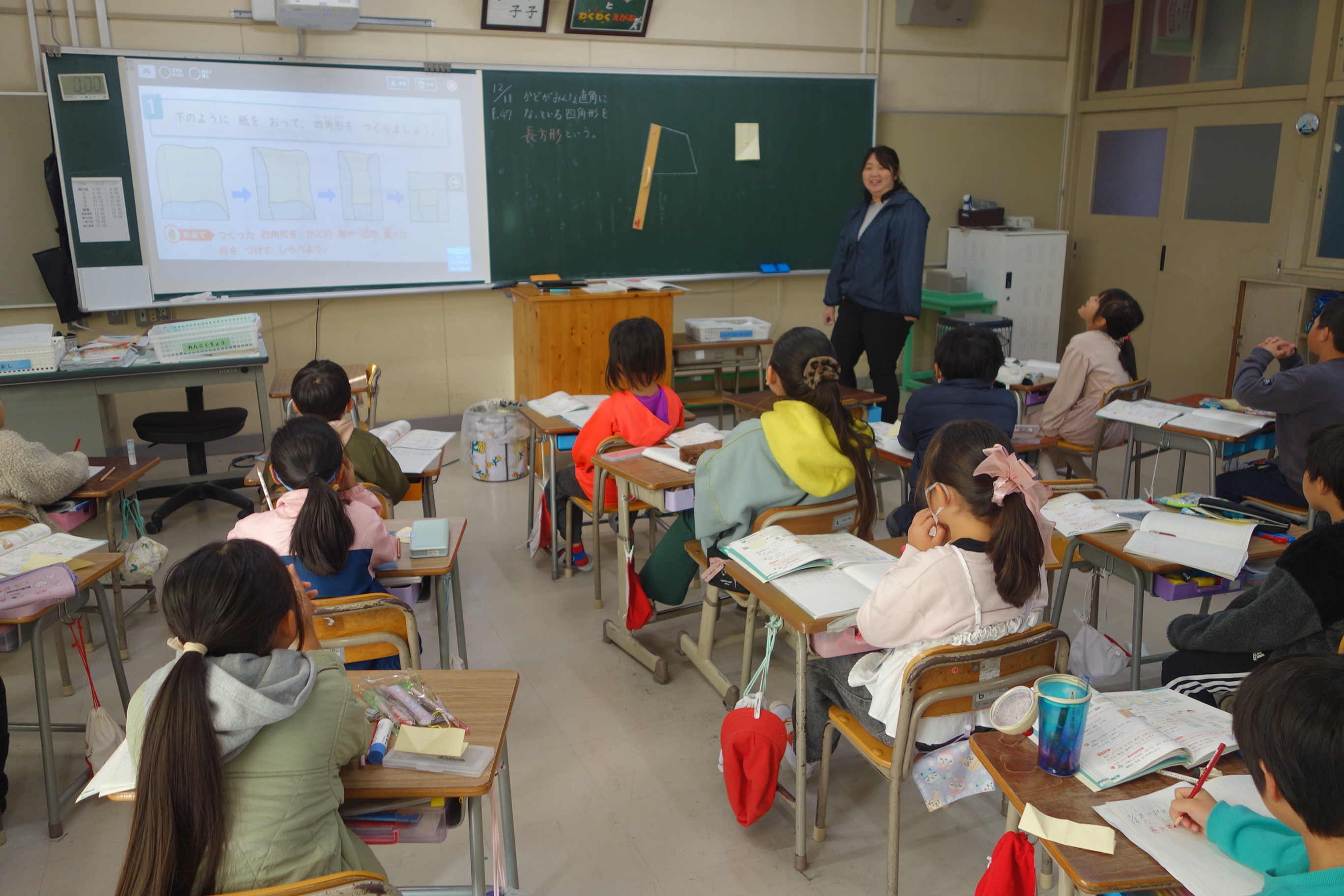 長方形と正方形 2年生 2025.12.11 2年生の算数は、図形の学習を進めています。この日は、紙を折って全ての角が直角の四角形を作りました。その四角形の名前が「長方形」だということを覚えました。そして、四角形が長方形になる条件をノートに書き覚えました。