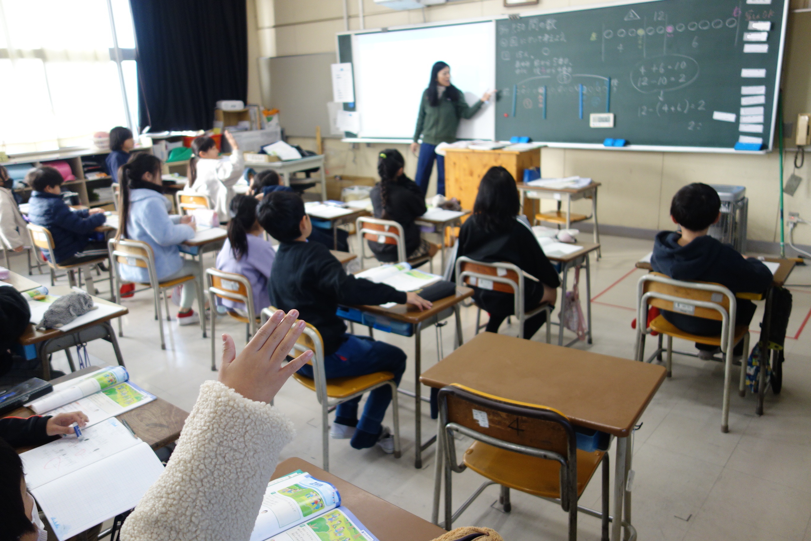 3年生3年生の算数は、1列に並んだものの数と順序との関係について学んでいます。まず、1列に並んだものの数とその間隔との関係を図に表して考えることを覚えました。図がなくても問題を解くことができることに気づいた子は、関係図なしで先生問題に挑戦しました。