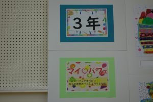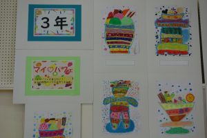 先日行われた作品展を学年ごとにふりかえり、一部の平面作品をご紹介します。展示された状態で撮影したため、展示方法とカメラアングルの関係で作品の大きさに差異があったり同じ作品が何度も映り込んでいること等があったりしますがご容赦ください。この日は3年生の平面作品の一部を紹介させていただきます。