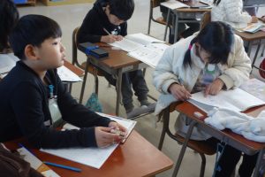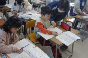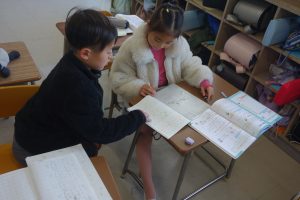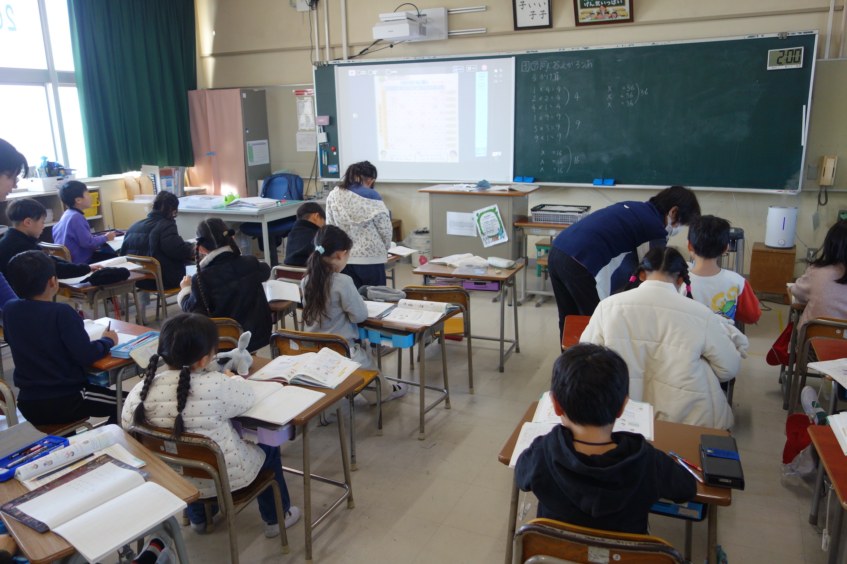 2年生の算数は、九九のきまりについて学んでいます。この日は九九の表を参考に、同じ答えになるかけ算がいくつあるのかを調べました。同じ答えが3つあるかけ算を探してノートに書きとめ、ペアになって確認し合いました。その後みなさん、はりきって発表していましたね。