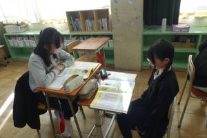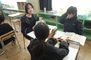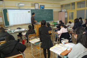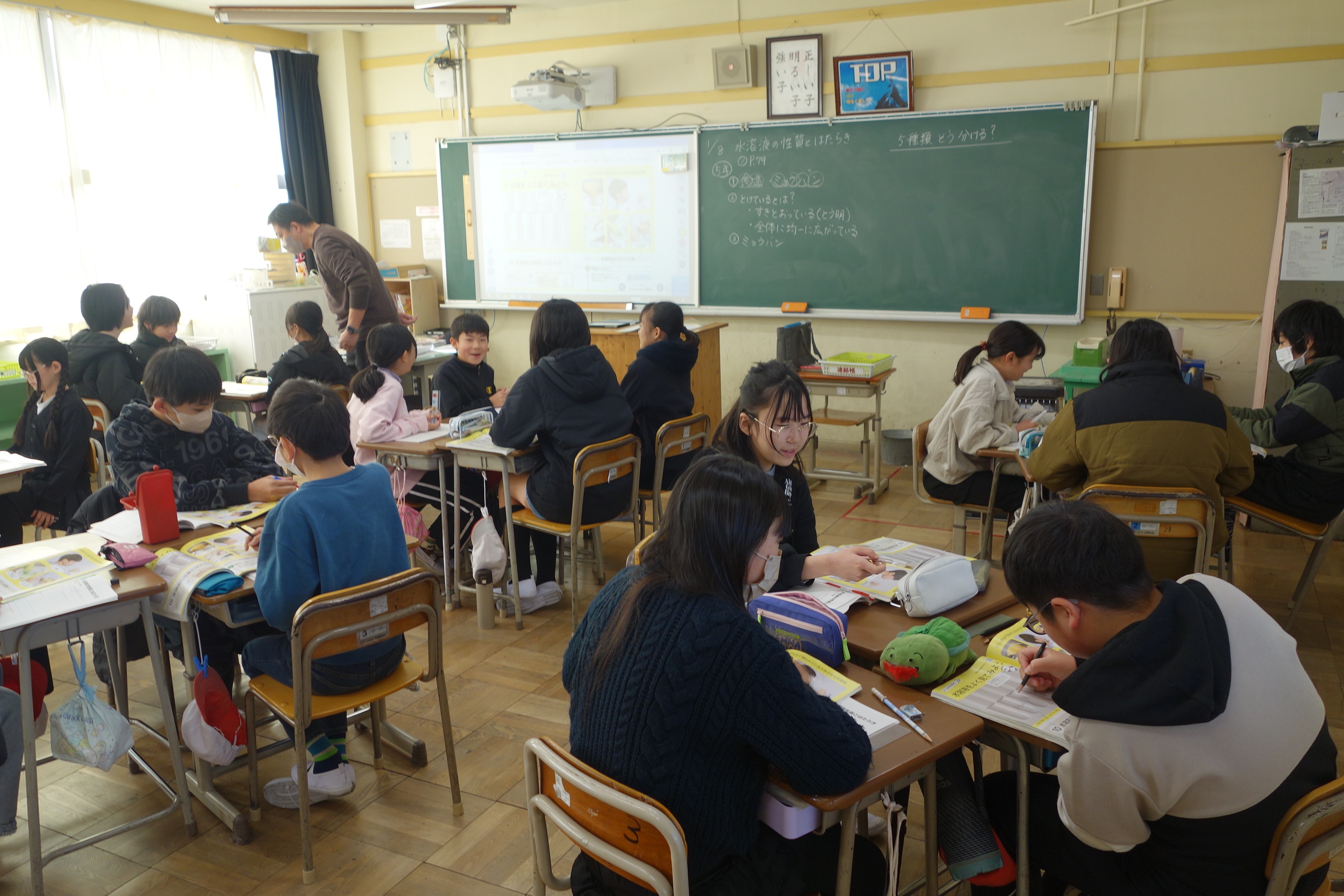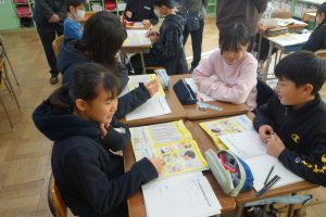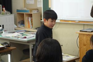 6年生の理科は、食塩水や塩酸、炭酸水などの透明な5種類の水溶液の見分け方について考えました。どのように見分けたらよいのか、どんな方法を使えばよいのかをグループになって話し合いました。「水溶液に葉を入れてみる」「水を蒸発させてみる」「金属を入れてみる」「においをかいでみる」「石灰水を入れてみる」等など、いろいろな考えが出ていました。