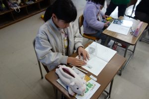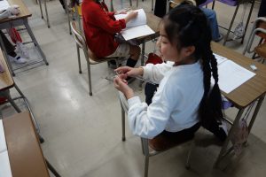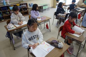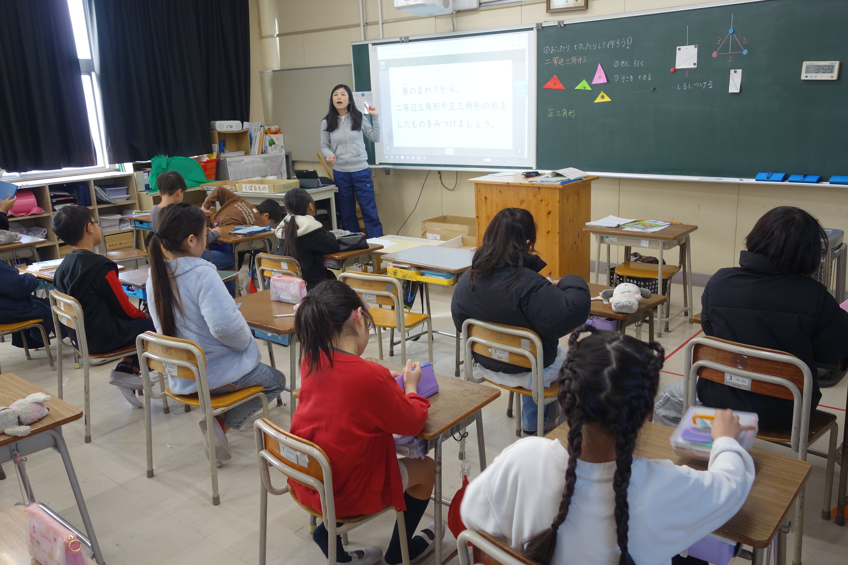 3年生3年生の算数は図形の学習をしています。この日は、二等辺三角形と正三角形を折り紙で作ってみました。その後で、教室内にある二等辺三角形と正三角形を探しました。温度計の模様や名札入れの金具などを見つけました。そして多くの子は、三角定規のひとつが二等辺三角形だということに気づきました。