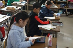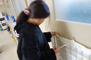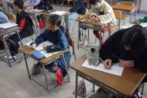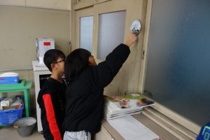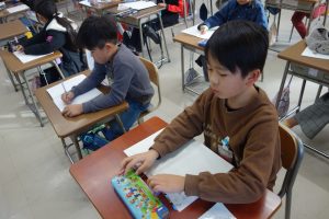 3年生の算数は図形の学習をしています。この日は、二等辺三角形と正三角形を折り紙で作ってみました。その後で、教室内にある二等辺三角形と正三角形を探しました。温度計の模様や名札入れの金具などを見つけました。そして多くの子は、三角定規のひとつが二等辺三角形だということに気づきました。