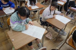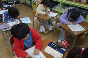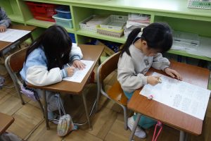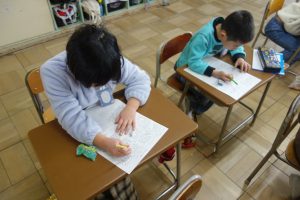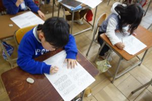 1年生の算数は、大きな数の学習をしています。10が10集まって100になることを覚えたので、10とびや5とびなど、いろいろな数え方ができるようになりました。そこで、プリントの大きい数を数える練習問題に挑戦しました。鉛筆で自分で決めた数ずつ囲いながら、一生懸命数えていました。