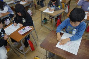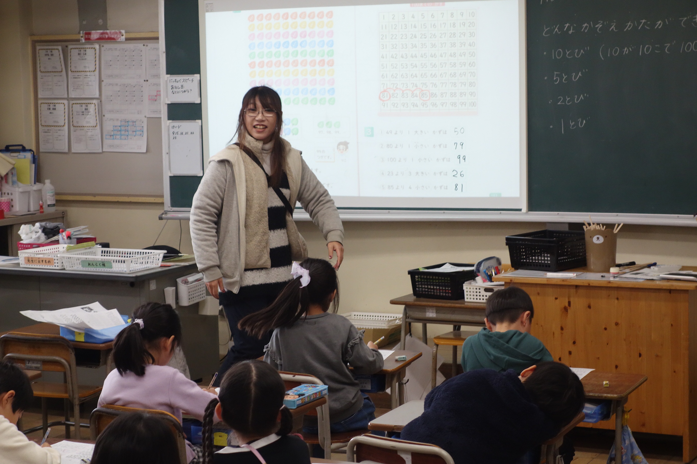 1年生1年生の算数は、大きな数の学習をしています。10が10集まって100になることを覚えたので、10とびや5とびなど、いろいろな数え方ができるようになりました。そこで、プリントの大きい数を数える練習問題に挑戦しました。鉛筆で自分で決めた数ずつ囲いながら、一生懸命数えていました。