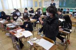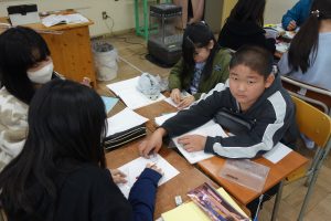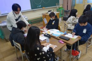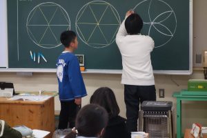 5年生の算数は、図形の学習をしています。この日は、円を使って正六角形をかく方法をみんなで考え、出し合いました。円の中心から間の角が60度になる補助線を引く方法や三角定規の60度の角を使う方法、コンパスを使う方法など、いろいろな考え方がありましたね。