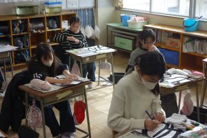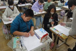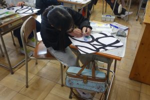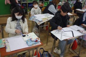5年生の図画工作は、自分の名前をデザインに組み込んだ絵画の制作に取りかかっています。名前のレタリングを道に見立ててアクリル絵の具の黒で着色します。その後、まわりの絵を淡い水彩の色彩で仕上げていく予定です。色のコントラスト鮮やかな作品になりそうです。