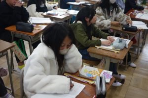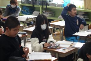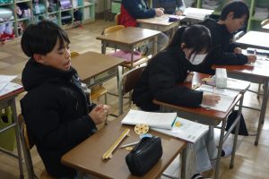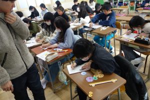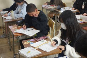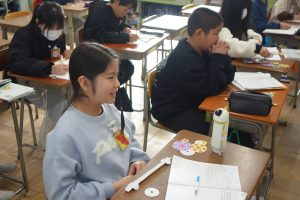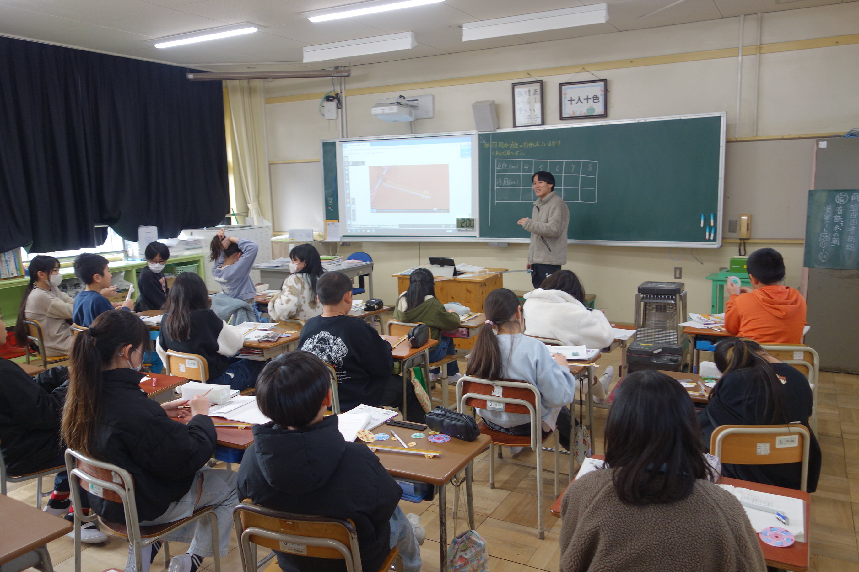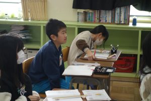 5年生の算数は、円のまわりの長さと直径の関係について考えています。まず、直径4~8cmの円のまわりの長さを実際にはかってみました。その後、そのまわりの長さを直径で割ってみたら、円周率とほぼ同じ値になることに気づきました。実際に測って計算した円周率の値はしばらく忘れないでしょうね。