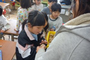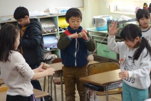 1年生の生活科は、冬の遊びに挑戦しています。前回は、昔ながらのコマ回しに挑戦しました。ひもを巻き付けて上手く回すのにはコツが必要でした。今回はヨーヨーに挑戦しました。ひもで回すところは共通していますが、こちらの方がやりやすそうです。みなさん、ヨーヨーを見たときから目がきらきらしていましたね。