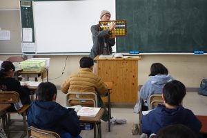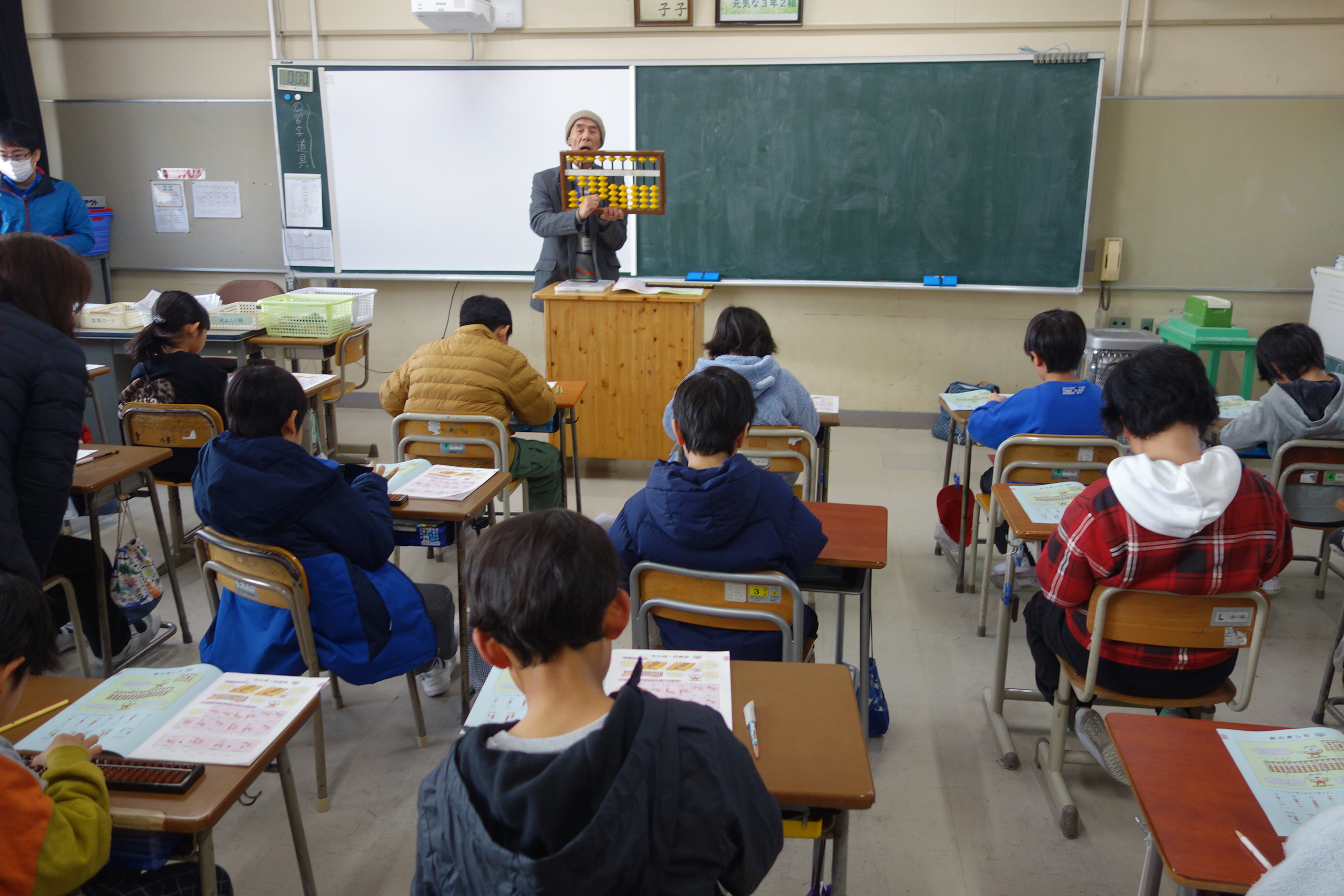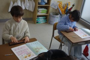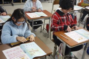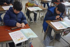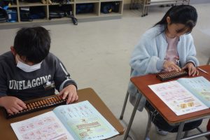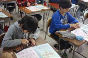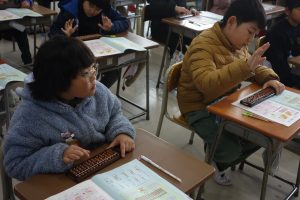 そろばん 3年生 2026.01.27 3年生は講師の先生をお招きしてそろばんの学習に取り組みました。この日はその初日です。そろばんの持ち方から玉のはじき方まで、基礎をしっかりと教えていただきました。皆、講師の先生の話に集中して一生懸命計算をしていました。