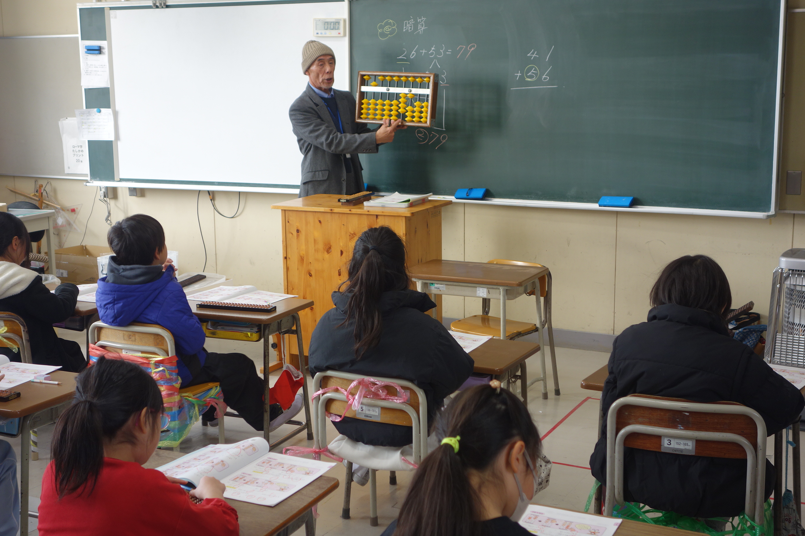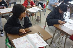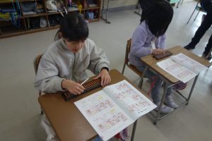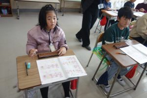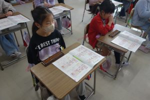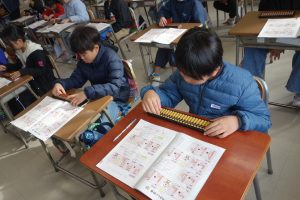 3年生は講師の先生をお招きしてそろばんの学習に取り組んでいます。2日目は初日と別の学級の番です。紙面の問題に加えて、講師の先生にも問題をだしていただきながら、そろばんの使い方を覚えました。みなさん、とても意欲的に計算に取り組んでいました。