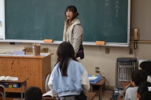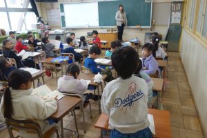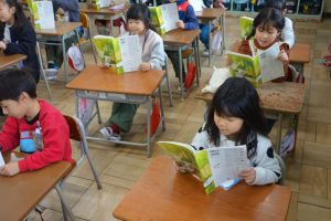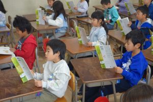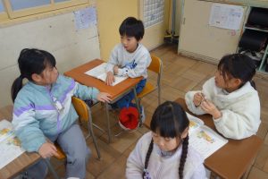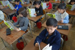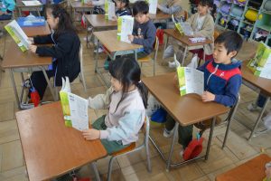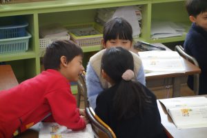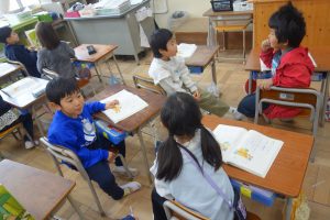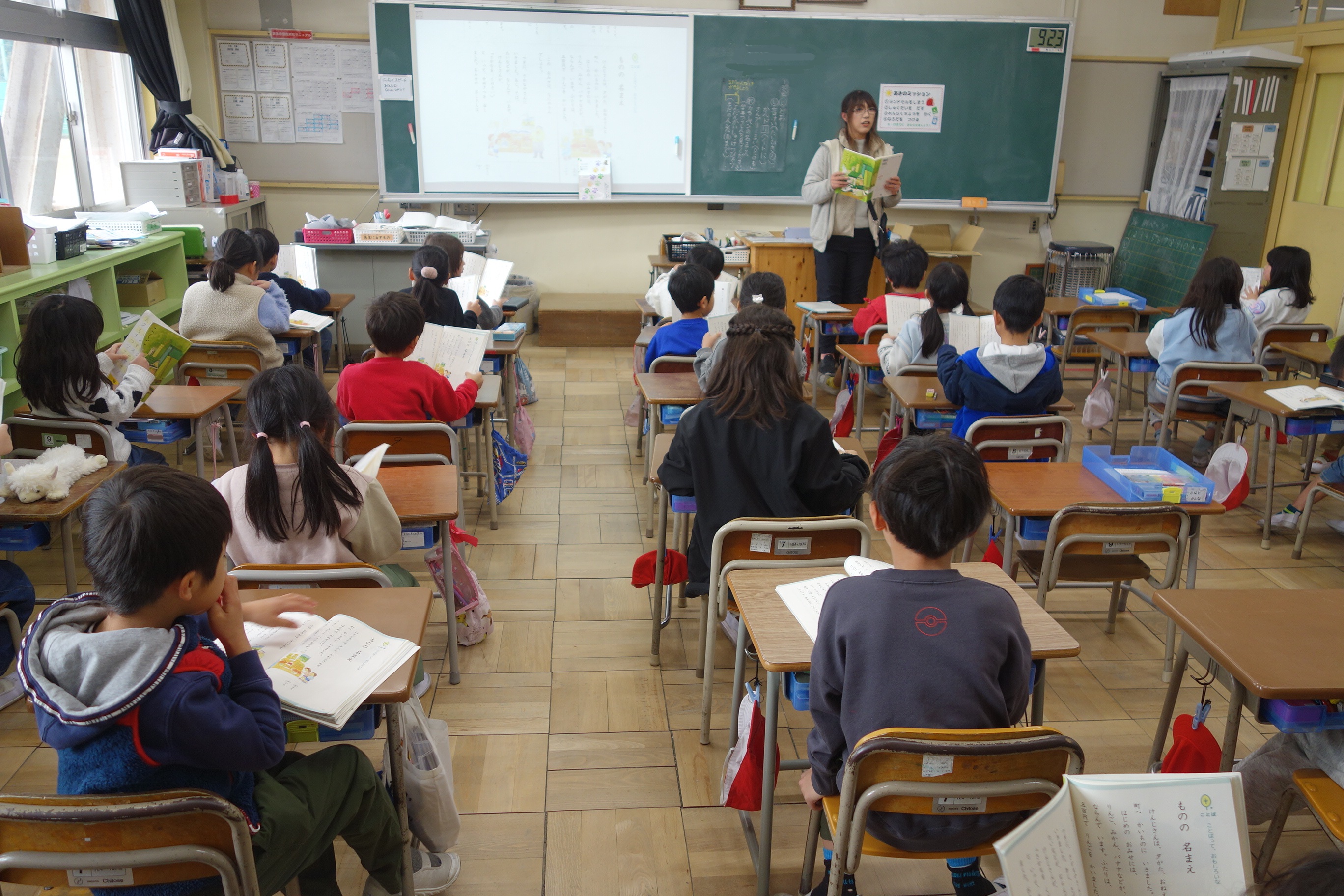 ものの名まえ 1年生 2026.01.29 1年生の国語は『ものの 名まえ』の学習をしています。この日は、まず最初に全員で音読をして内容を知りました。その後、果物屋さんで売っている物には何があるのかを近くの席の子と相談してから発表しました。
