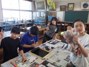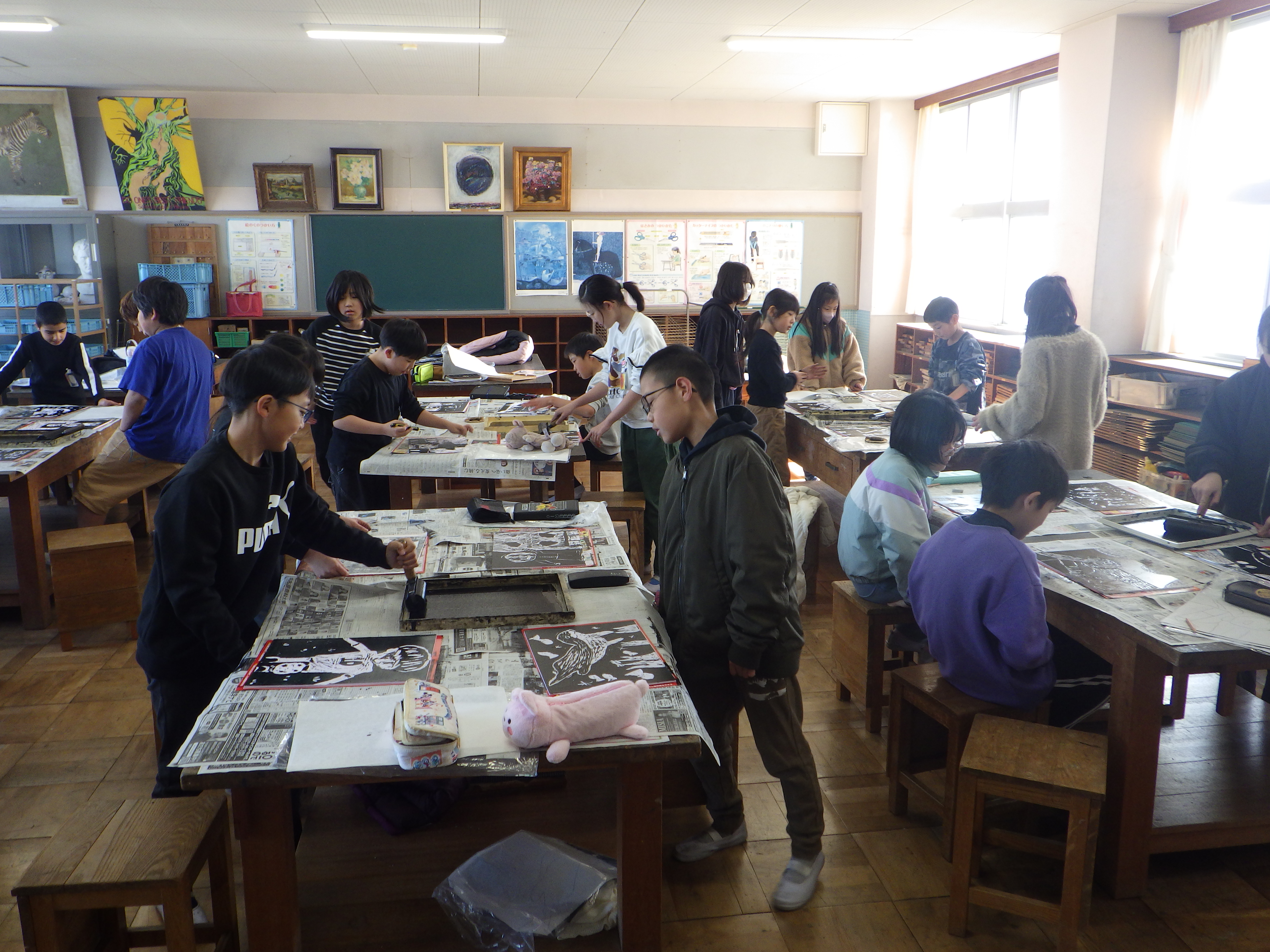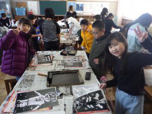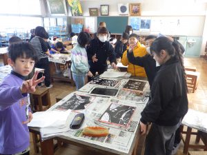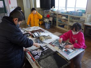 4年生 図工(版画)のようす(^^)/ 4年生 2026.01.29 4年生の図工では、彫刻刀を使って版画作品を作っています。 初めての彫刻刀も、安全に使うことができました。 彫った板にインクをつけ、和紙に刷りました。 とっても上手な作品になりました。2月の授業参観で掲示する予定です!