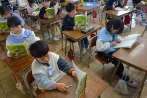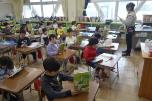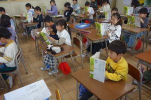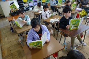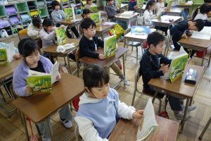 わらしべちょうじゃ 1年生 2026.02.05 1年生の国語は、有名な昔話の楽しさを味わいました。この日は、挿絵を見てお話を想像した後で、音読をしてお話を知りました。次はどうなるのかと、話の展開にわくわくした子も多かったのではないでしょうか。