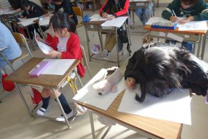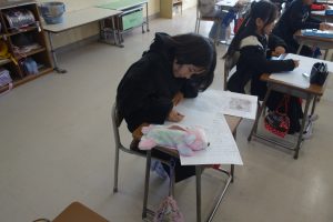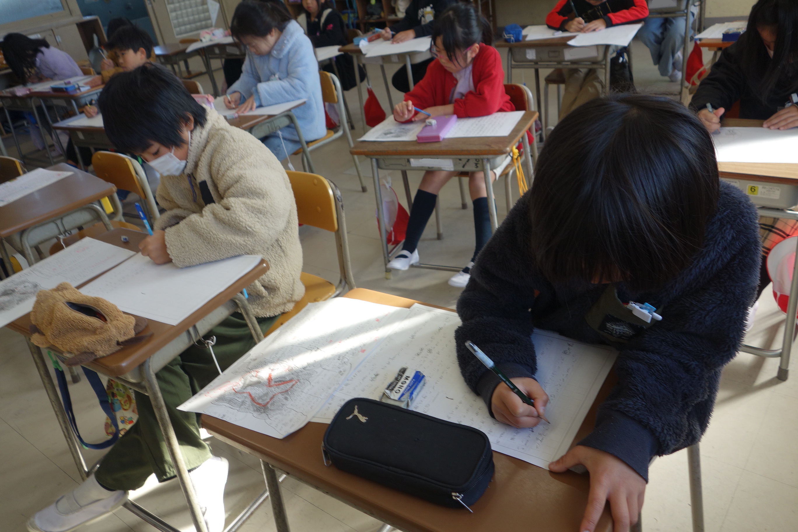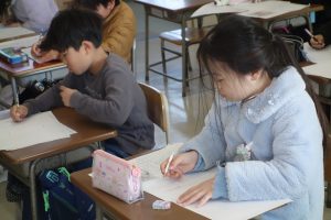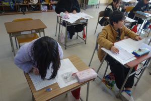 3年生の国語では、物語を書いています。地図をもとに宝物を探す冒険のお話です。地図を見て思い浮かんだ登場人物やエピソードなどを地図にメモ書きして物語を書き始めました。みなさん自分の思い描いた物語の世界に入り込んでいたようで、集中して書いていましたね。完成がとても楽しみです。